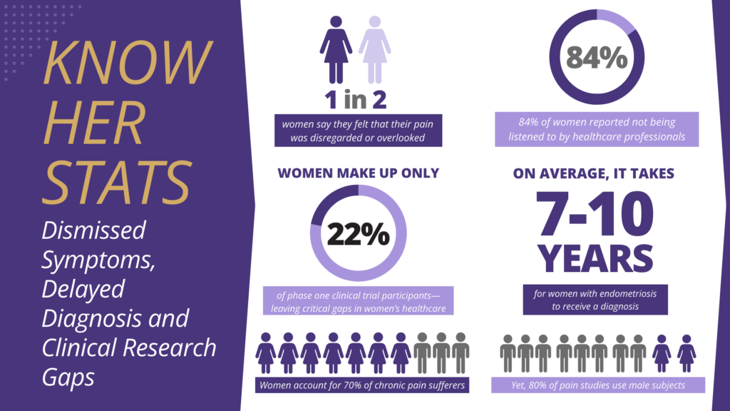 The urgency to advance women’s healthcare standards is underscored by persistent disparities in diagnosis, treatment, and research. For example, women with endometriosis wait, on average, between seven and ten years to receive an accurate diagnosis (Endometriosis Foundation of America, n.d.). In the 2022 KFF Women’s Health Survey, they found that 29% of participants reported that healthcare providers have dismissed or minimized their symptoms (KFF, 2022). Another study found that 1 in 2, or 50% of participants, reported that they felt their pain was disregarded or overlooked by their provider (GOV.UK, 2022).