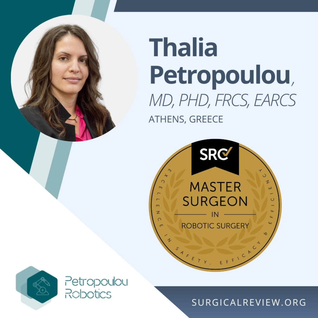 Thalia Petropoulou, MD, PHD, FRCS, EARCS has been accredited as an SRC Master Surgeon in Robotic Surgery. Dr. Petropoulou practices at Petropoulou Robotics in Athens, Greece.