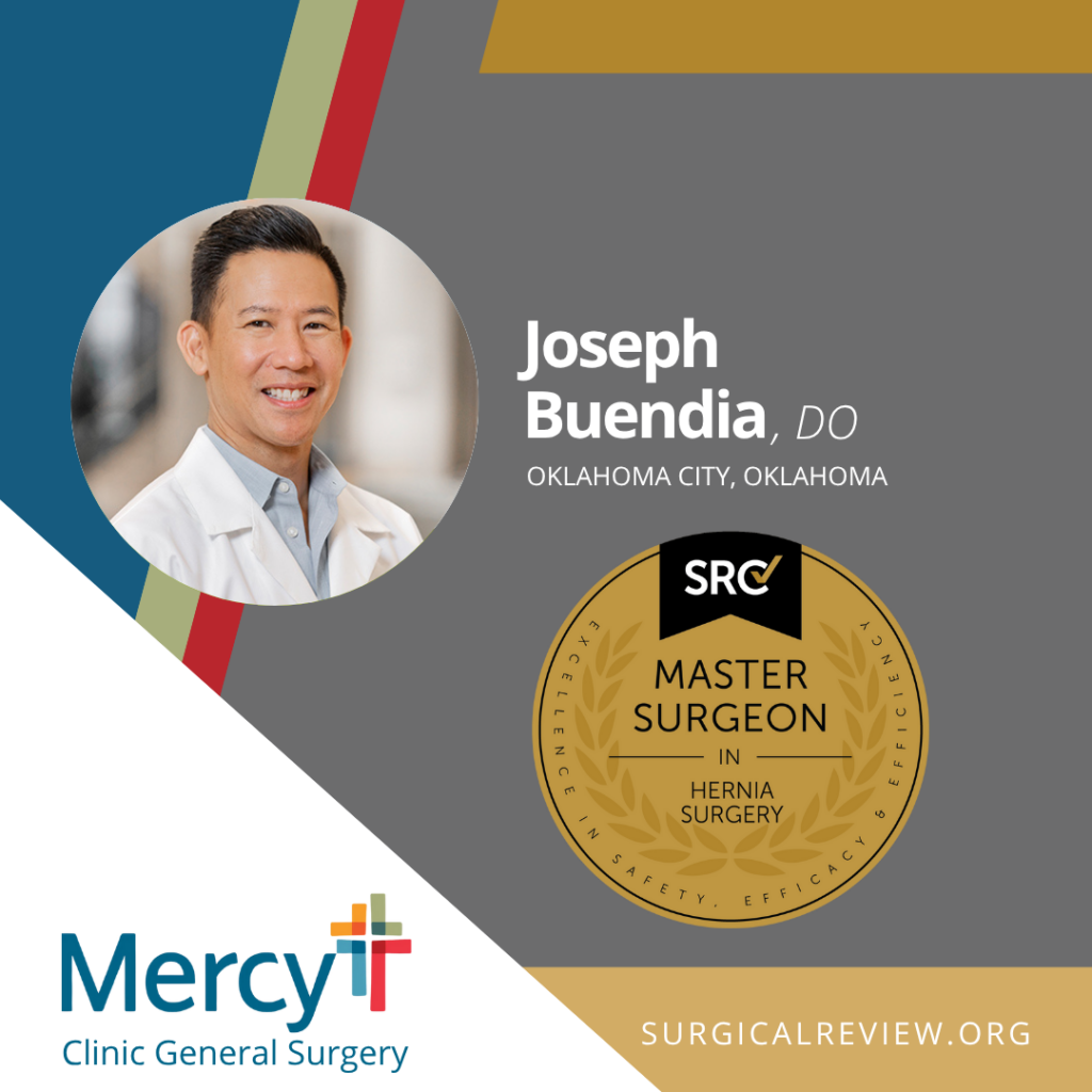 Joseph Buendia, DO has been accredited as an SRC Master Surgeon in Hernia Surgery. Dr. Buendia practices at Mercy Hospital Oklahoma City and Mercy Clinic General Surgery in Oklahoma City, Oklahoma.