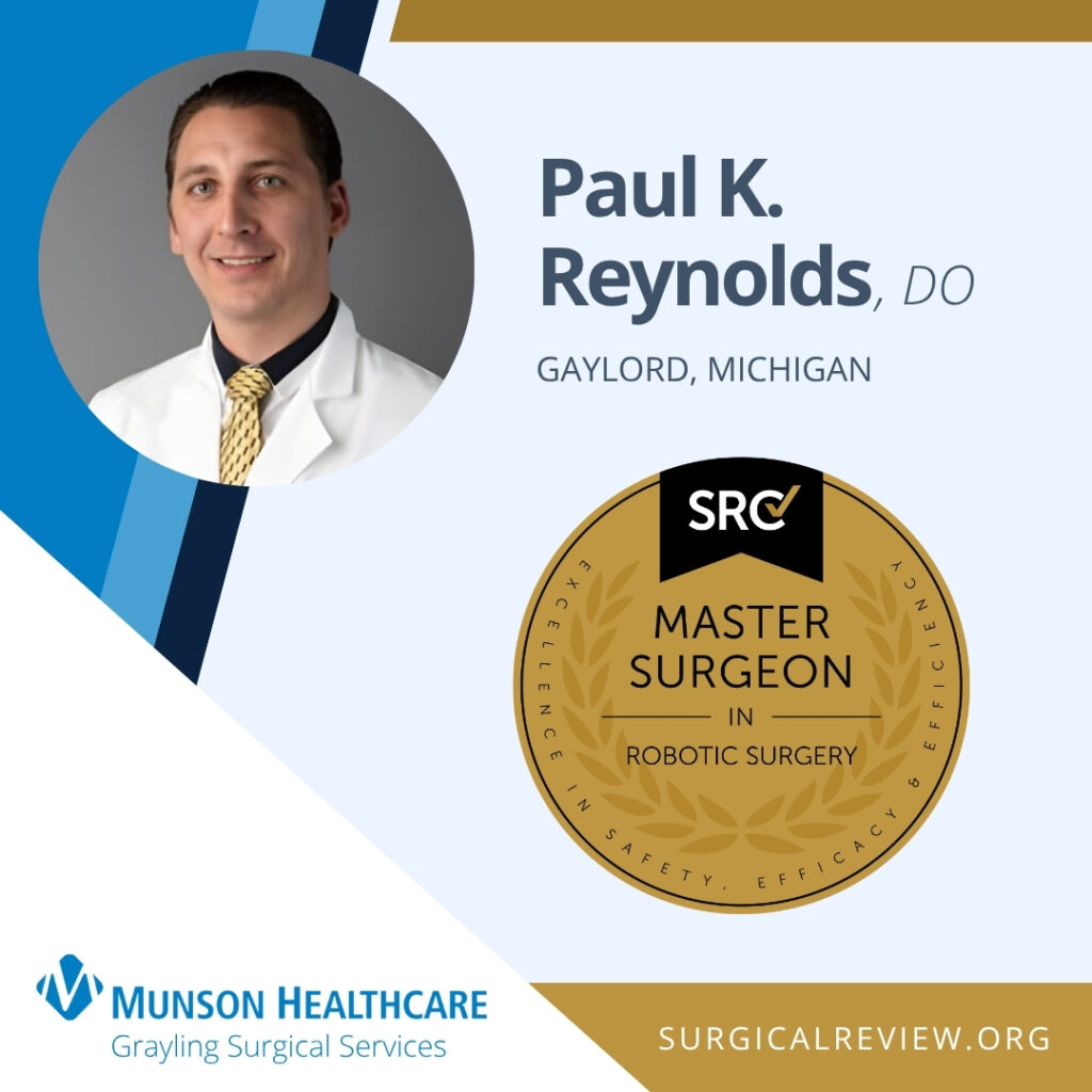 Paul K. Reynolds, DO has been accredited as an SRC Master Surgeon in Robotic Surgery. Dr. Reynolds practices at Munson Healthcare Otsego Memorial Hospital and Munson Healthcare Grayling Surgical Services in Gaylord, Michigan.