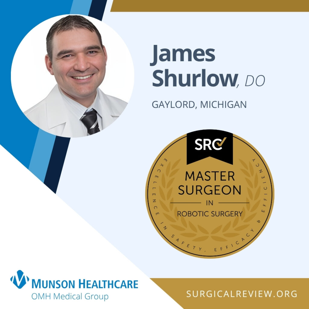 James Shurlow, DO has been accredited as an SRC Master Surgeon in Robotic Surgery. Dr. Shurlow practices at Munson Healthcare Otsego Memorial Hospital and OMH Medical Group General Surgery in Gaylord, Michigan.