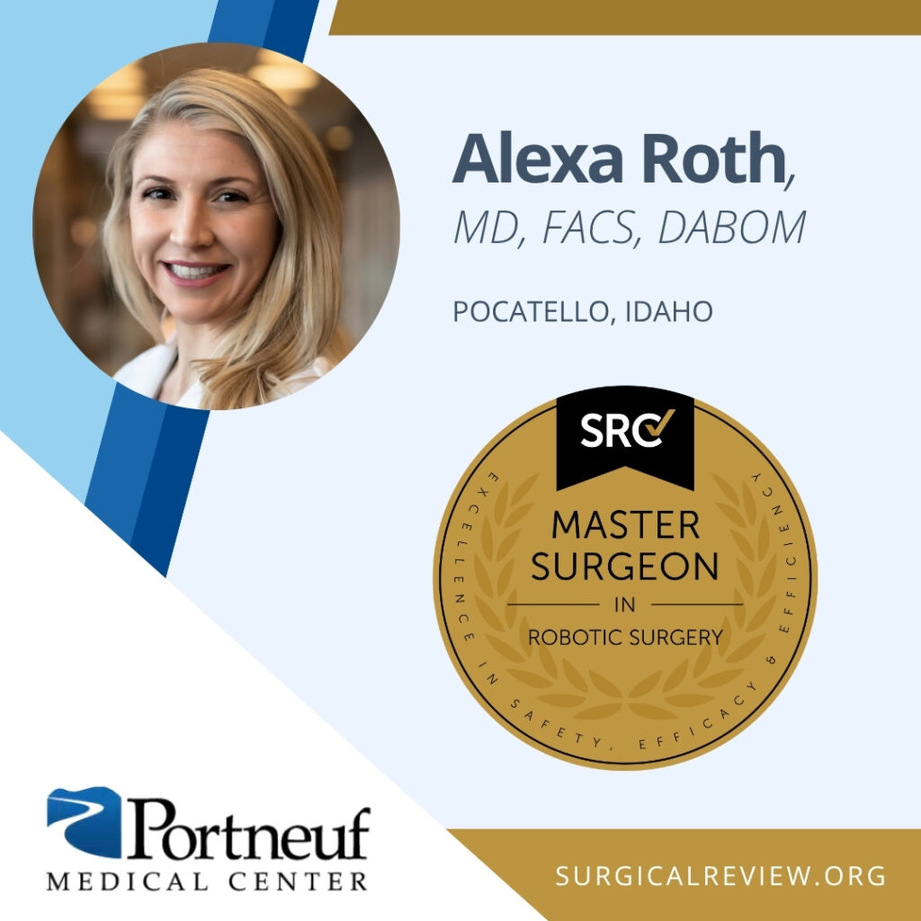 Alexa Roth, MD, FACS, DABOM has been accredited as an SRC Master Surgeon in Robotic Surgery. Dr. Roth practices at Portneuf Medical Center and Portneuf Bariatrics in Pocatello, Idaho.