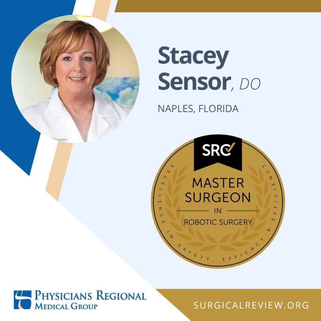 Stacey Sensor, DO has been accredited as an SRC Master Surgeon in Robotic Surgery. Dr. Sensor practices at Physicians Regional Medical Group in Naples, Florida.