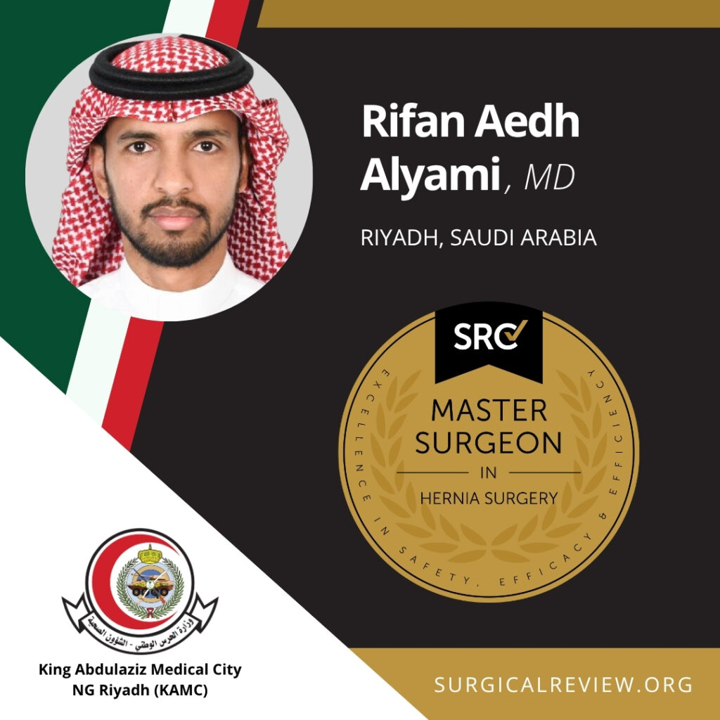 Rifan Aedh Alyami, MD has been accredited as an SRC Master Surgeon in Hernia Surgery. Dr. Alyami practices at King Abdulaziz Medical City Riyadh.