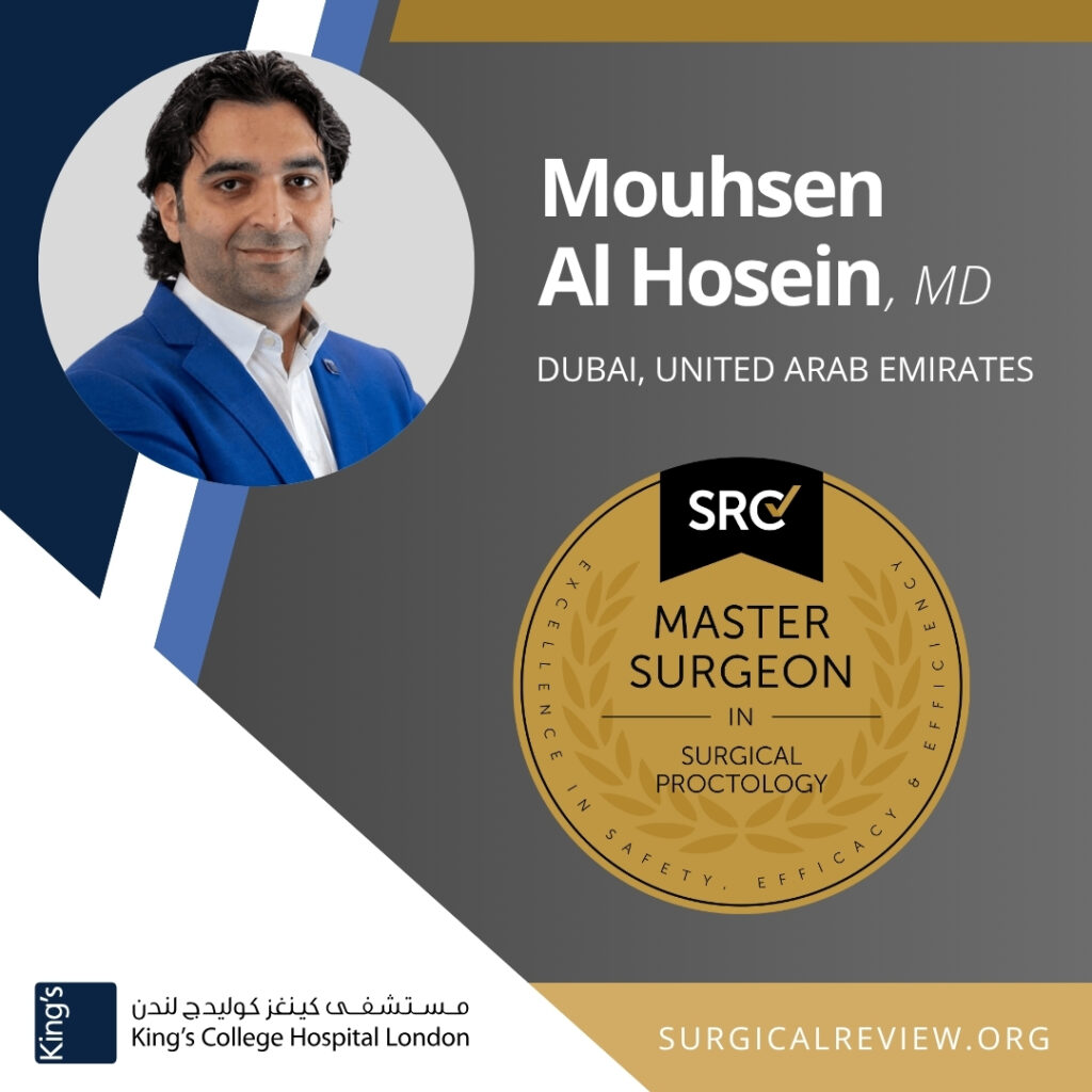 Mouhsen Al Hosein, MD has been accredited as an SRC Master Surgeon in Surgical Proctology. Dr. Al Hosein practices at King’s College Hospital London in Dubai, United Arab Emirates.